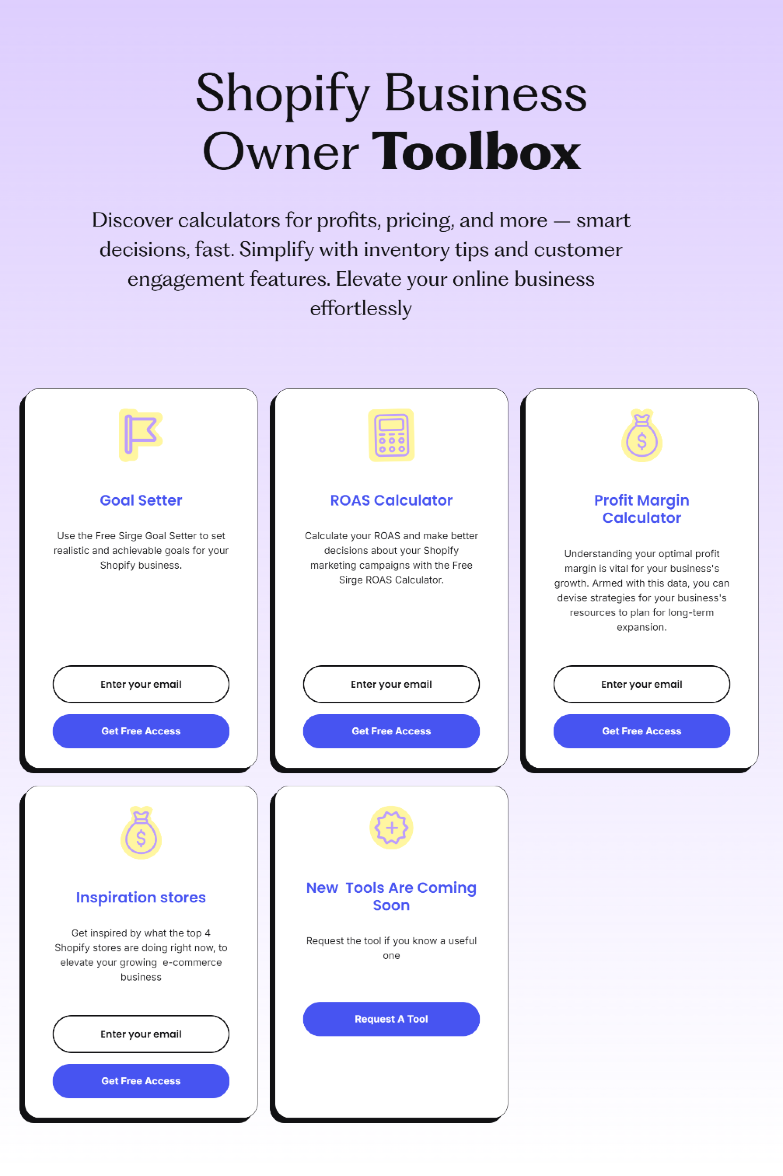 When Chuffed first worked with Sirge, an app for growing e-commerce stores, the process was clunky and slow. So, we launched a Toolbox on their marketing site and built small tools for specific problems.